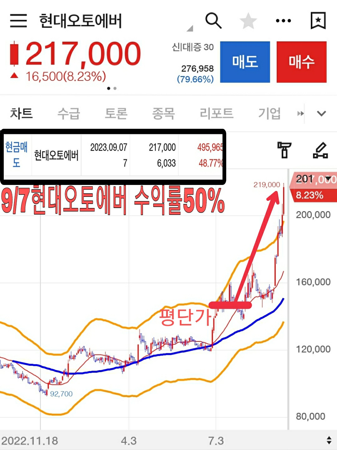 현대오토에버 일봉차트로 추세가 형성되고 고점을 돌파하는 것을 확인 후 매수에 임하였고 그 생각이 적중하여 좋은 수익으로 연결되었습니다.