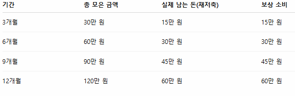 3개월 마다 모인 금액의 절반은 저축하고 절반은 자기 보상에 사용하여 저축의 습관을 들이는 방법으로 유용합니다.