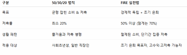 50/30/20 법칙과 FIRE 실천방법 비교차트
