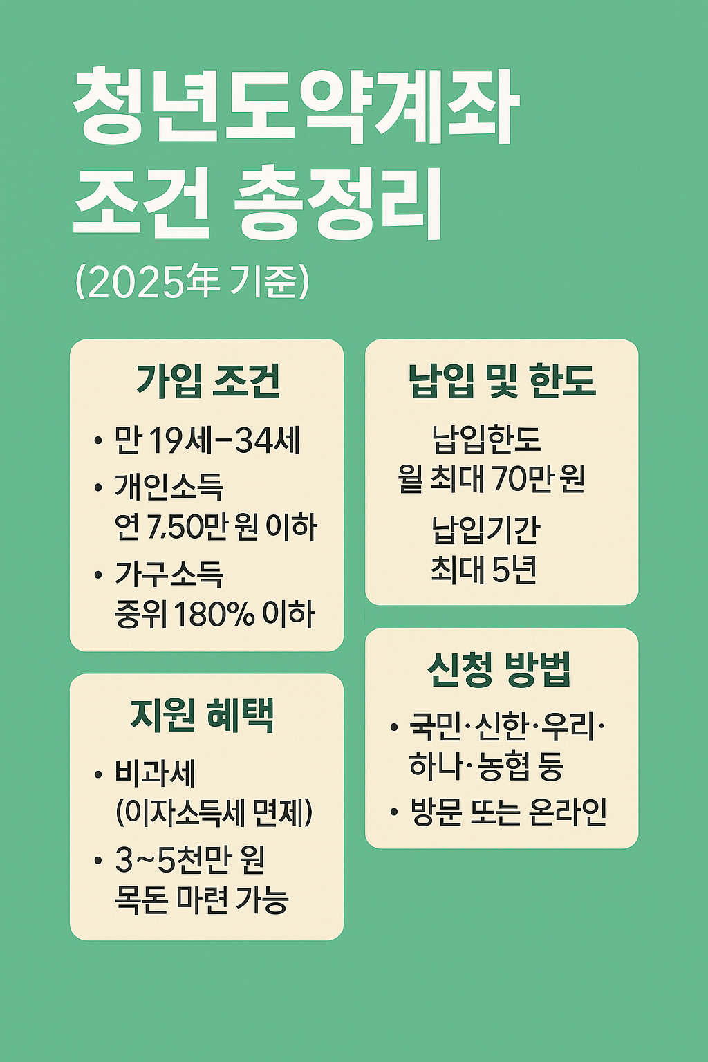 청년도약계좌는 만 19세~34세 청년이 최대 5년간 저축하면, 정부가 이자 지원와 비과세 혜택을 더해 목돈 마련을 돕는 제도입니다.