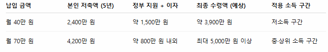 예: 월 70만 원 저축 시, 정부가 추가 지원해 5년 후 최대 5천만 원 이상 마련 가능 합니다.