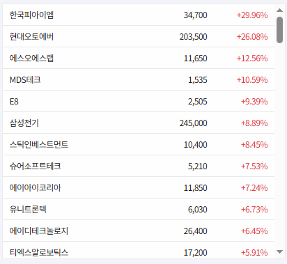 주가 상승률 순으로 표기 되었습니다. 종목들 공부하기 좋아 보입니다.