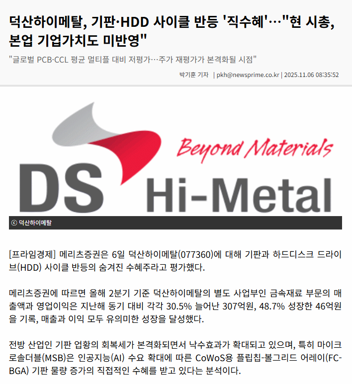 덕산하이메탈 기판 HDD 사이클 반등 직수혜라고 하며 아주 긍정적인 뉴스가 나왔습니다.