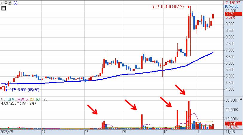 후성 일봉차트입니다. 거래량을 터트리며 우상향 하고 있습니다.